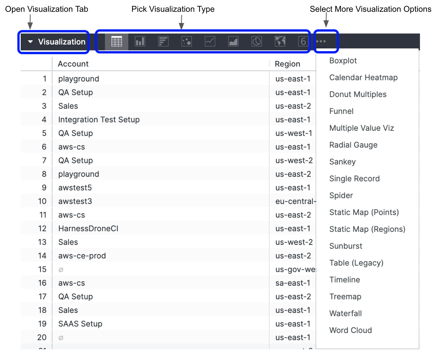 - Use the chart buttons to pick the visualization type that’s right for the data. For more information, see Visualization types.