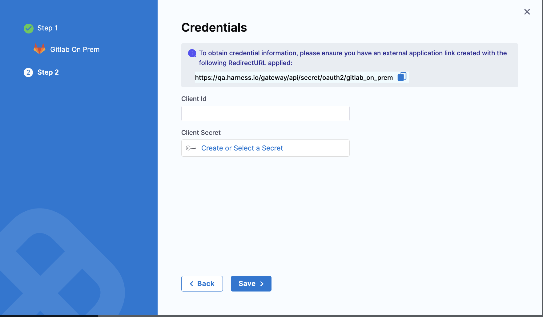 Currently, support for OAuth configuration with the self-hosted and onprem Gitlab provider is behind the feature flag and PIPE_ENABLE_GITLAB_ON_PREM_FLOW . Please contact Harness support to enable this feature.