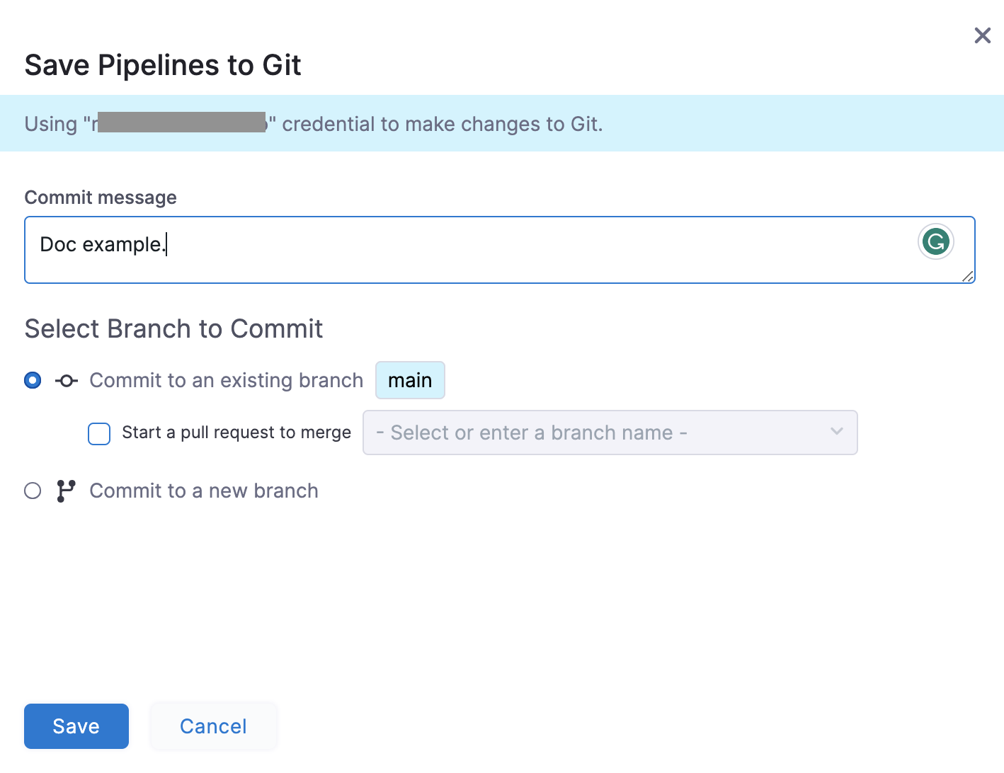 2. Edit the pipeline and select Save. The Save Pipelines to Git settings appear. Harness displays the user name being used for this commit.