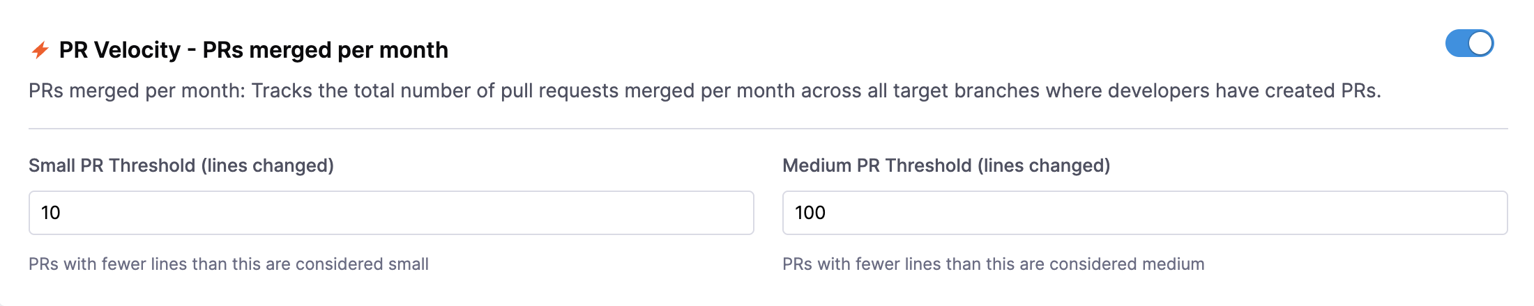 These thresholds help categorize PRs for size based analysis in metrics like PR Velocity.