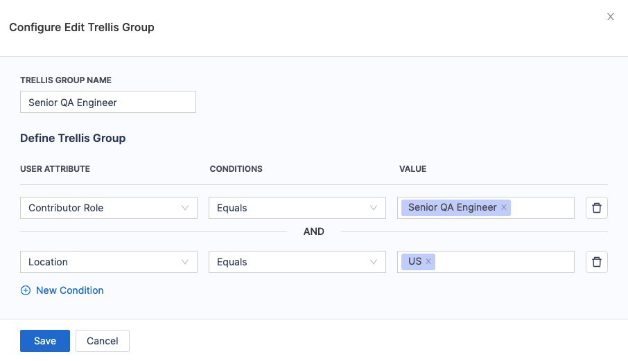 • Click on Add Trellis Groups to create a unique group and define matching criteria for identifying users based on custom contributor attributes like Role and Location.